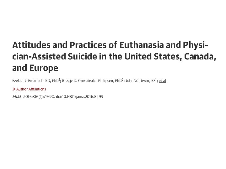 • Public support in the United States has plateaued since the 1990 s (range, 47%-69%) • In Western Europe, an increasing and strong public support; in Central and Eastern Europe, support is decreasing • In the United States, less than 20% of physicians report having received requests for euthanasia or physician-assisted suicide, and 5% or less have complied • In Oregon and Washington state, less than 1% of licensed physicians write prescriptions for physician-assisted suicide per year • In the Netherlands and Belgium, about half or more of physicians reported ever having received a request; 60% of Dutch physicians have ever granted such requests • Between 0. 3% to 4. 6% of all deaths are reported as euthanasia or physician-assisted suicide in jurisdictions where they are legal