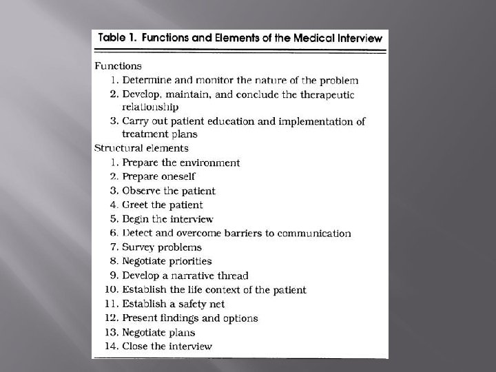 Physicians should: q sit down q attend to patient comfort q establish eye contact q listen without interrupting q show attention with nonverbal cues, such as nodding