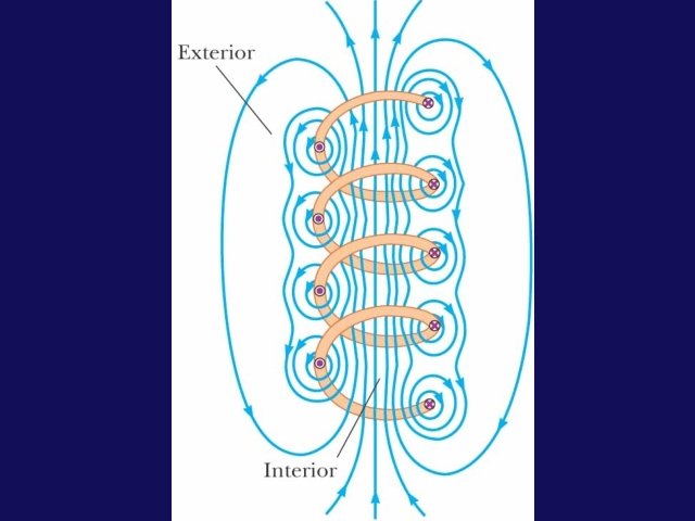 B Field of a ¥ Solenoid • To calculate the B field of the ¥ solenoid using Ampere's Law, we need to justify the claim that the B field is 0 outside the solenoid. • To do this, view the ¥ solenoid from the side as 2 ¥ current sheets. • The fields are in the same direction in the region between the sheets (inside the solenoid) and cancel outside the sheets (outside the solenoid). Þ xxxxx • • • (n: number of turns per unit length)
