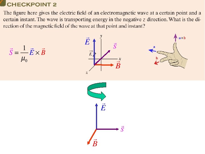 33. 3: The Traveling Wave, Qualitatively: Figure 33 -4 shows how the electric field and the magnetic field change with time as one wavelength of the wave sweeps past the distant point P in the last figure; in each part of Fig. 33 -4, the wave is traveling directly out of the page. At a distant point, such as P, the curvature of the waves is small enough to neglect it. At such points, the wave is said to be a plane wave. Here are some key features regardless of how the waves are generated: 1. The electric and magnetic fields and are always perpendicular to the direction in which the wave is traveling. The wave is a transverse wave. 2. The electric field is always perpendicular to the magnetic field. 3. The cross product always gives the direction in which the wave travels. 4. The fields always vary sinusoidally. The fields vary with the same frequency and are in phase with each other.