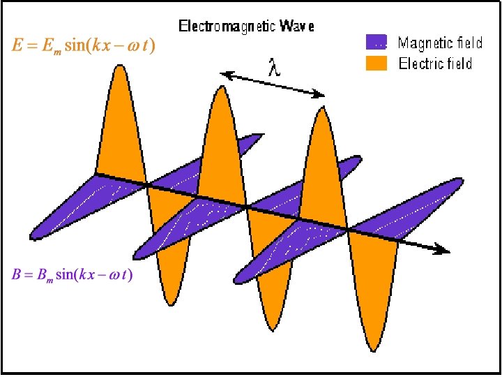 33. 3: The Traveling Wave, Qualitatively: We can write the electric and magnetic fields as sinusoidal functions of position x (along the path of the wave) and time t : Here Em and Bm are the amplitudes of the fields and, w and k are the angular frequency and angular wave number of the wave, respectively. The speed of the wave (in vacuum) is given by c. Its value is about 3. 0 x 108 m/s.