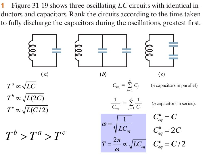 Example 2 • In an LC circuit, L = 40 m. H; C = 4 μF • At t = 0, the current is a maximum; • When will the capacitor be fully charged for the first time? • ω = 2500 rad/s • T = period of one complete cycle • T = 2π/ω = 2. 5 ms • Capacitor will be charged after T=1/4 cycle i. e at • t = T/4 = 0. 6 ms