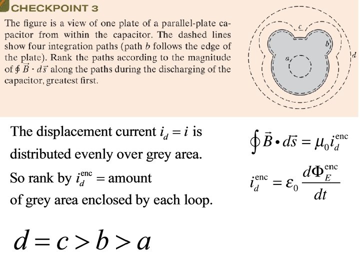 32. 4: Displacement Current: Comparing the last two terms on the right side of the above equation shows that the term must have the dimension of a current. This product is usually treated as being a fictitious current called the displacement current id: in which id, enc is the displacement current that is encircled by the integration loop. The charge q on the plates of a parallel plate capacitor at any time is related to the magnitude E of the field between the plates at that time by in which A is the plate area. The associated magnetic field are: AND