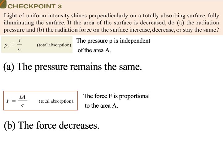 Radiation Pressure Waves not only carry energy but also momentum. The effect is very small (we don’t ordinarily feel pressure from light). If light is completely absorbed during an interval Δt, the momentum Transferred Δp is given by and twice as much if reflected. F A Newton’s law: Now, supposing one has a wave that hits a surface of area A (perpendicularly), the amount of energy transferred to that surface in time Δt will be I therefore Radiation pressure: [Pa=N/m 2]