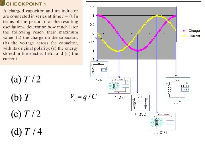 Example • In an LC circuit, L = 40 m. H; C = 4 μF • At t = 0, the current is a maximum; • ω = 2500 rad/s • When will the capacitor • T = period of one be fully charged for the complete cycle first time? • T = 2π/ω = 2. 5 ms • Capacitor will be charged after T=1/4 cycle i. e at • t = T/4 = 0. 6 ms