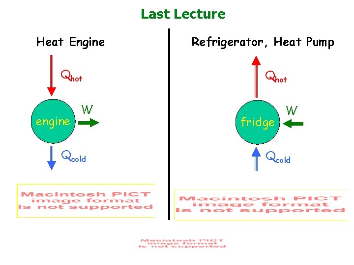 Last Lecture Heat Engine Qhot engine W Qcold Refrigerator, Heat Pump Qhot fridge W Qcold