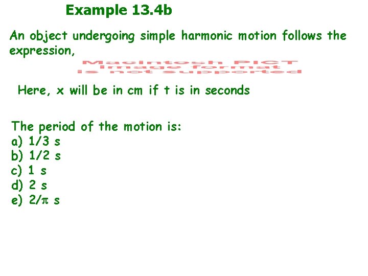 Example 13. 4 b An object undergoing simple harmonic motion follows the expression, Here, x will be in cm if t is in seconds The period of the motion is: a) 1/3 s b) 1/2 s c) 1 s d) 2 s e) 2/ s