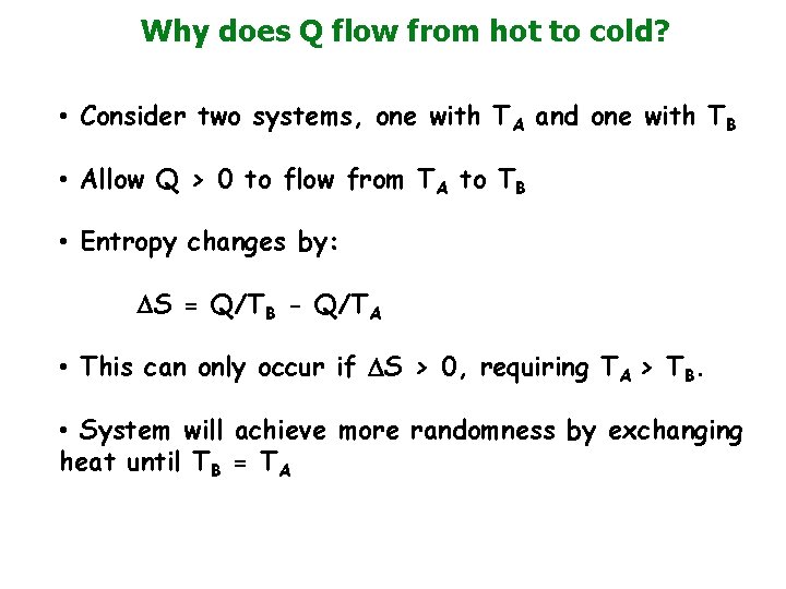 Why does Q flow from hot to cold? • Consider two systems, one with TA and one with TB • Allow Q > 0 to flow from TA to TB • Entropy changes by: DS = Q/TB - Q/TA • This can only occur if DS > 0, requiring TA > TB. • System will achieve more randomness by exchanging heat until TB = TA