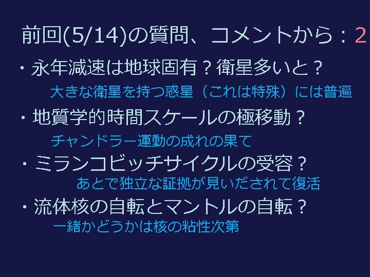 7. 現実的な地球・地球熱学 Realistic earth 粘弾性、マントル対流、プレート運動 viscoelasticity, mantle convection, plate mo 8. 固体地球の中の波動と振動 地震、地球自由振動 Wave and osc Earthquake, Free oscillation 9. 固体地球の電磁気学 地球磁場Geomagnetism Electromagnetics