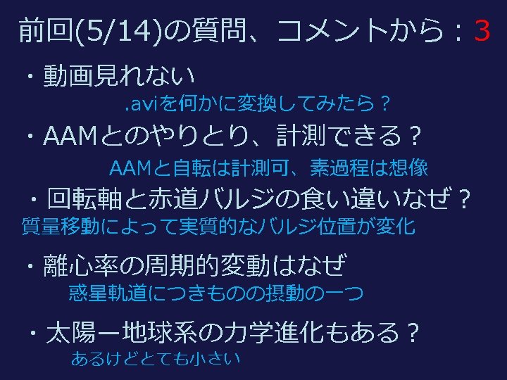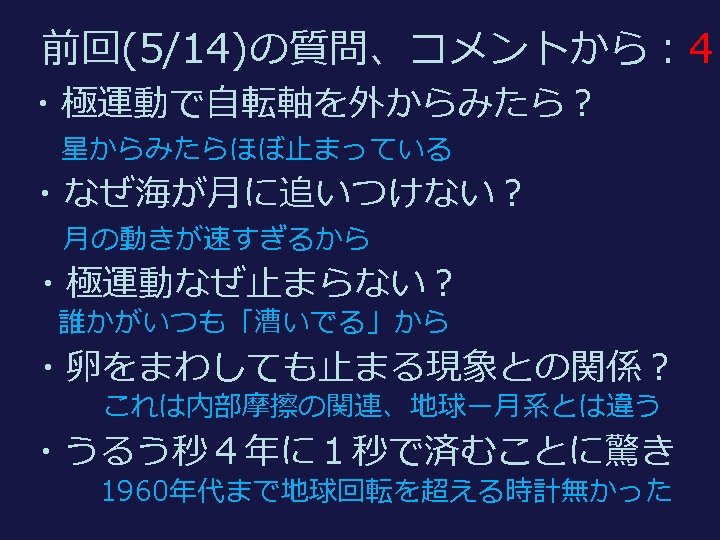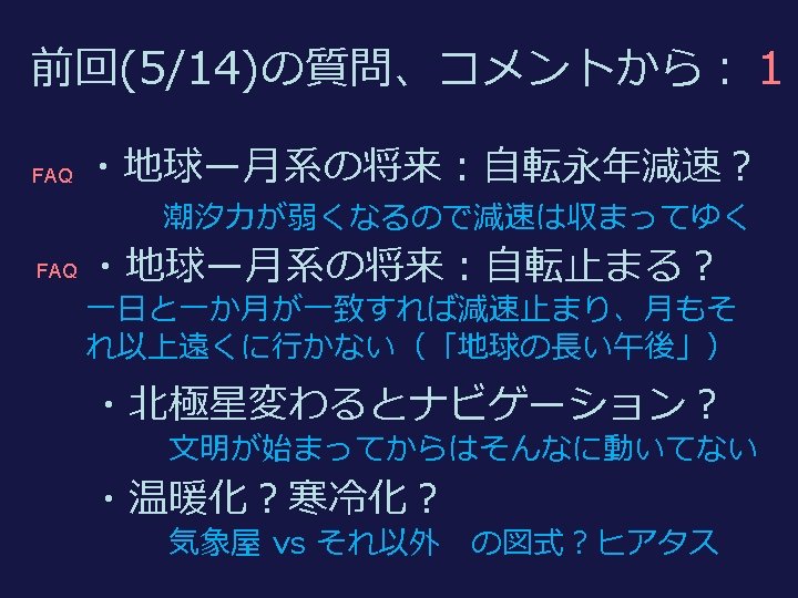 復習:潮汐摩擦と地球ー月系の進化 理想 Tidal friction and the Earth-Moon system ideal 現実 realistic 角運動量保存のため 月が遠ざかる The Moon goes away to conserve angular momentum トルクが自転を減速 Torque brakes the spin