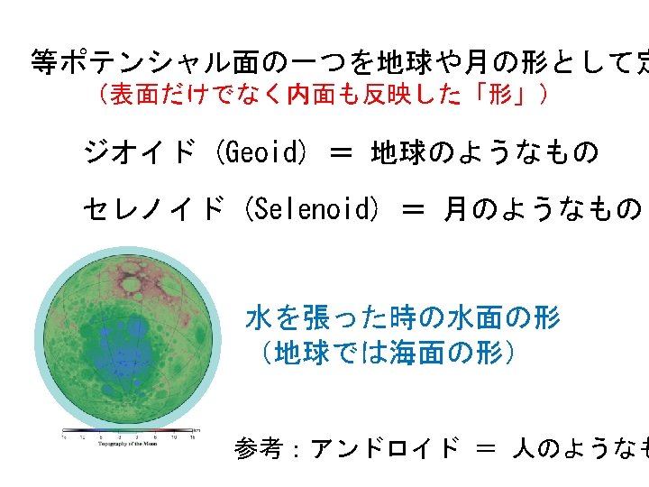 月の等ポテンシャル 面 Selenoid (SGM 100 h) 地球の等ポテンシャ ル面 Geoid (GRACE 360次) 月の方がでこぼ こ Selenoid is more irregular