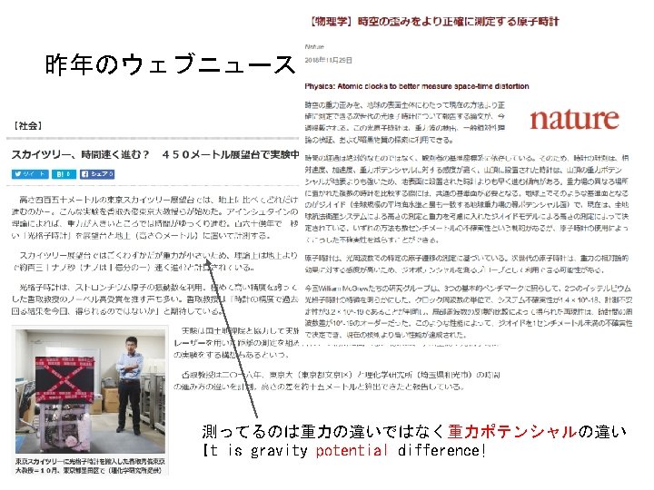 最近の話題 重力ポテンシャルの直接計測 Lisdat et al. , Nature Comm. 2016. The strontium lattice clocks are located at the national metrology institutes SYRTE and PTB in Paris and Braunschweig, respectively. The course and lay-out of the fibre link sections to Strasbourg (705 km from Paris, 710 km from Braunschweig) are indicated on the map. Additionally, the individual setups consisting of a clock laser, optical lattice, fs frequency comb, transfer laser and stabilized link are shown schematically. In Strasbourg, the frequency difference between the transfer lasers is measured.