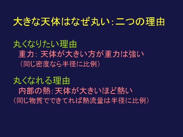大きな天体=中が熱い天体=柔らかい天体 Large body = hot inside = soft body 大きいほどアイソスタシーが効いて凸凹がならされる Isostatic compensation more effective in a large body 地殻 crust マントル mantle