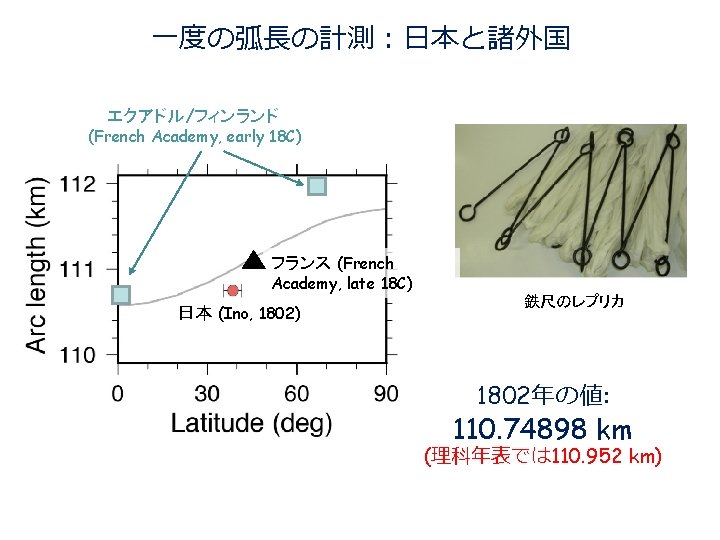 緯 度 一 度 分 の 距 離 は 二 十 八 里 二 分 Astronomical latitude measurement Measurement in 1802: Meridian arc length: 110. 74898 km (110. 952 km)
