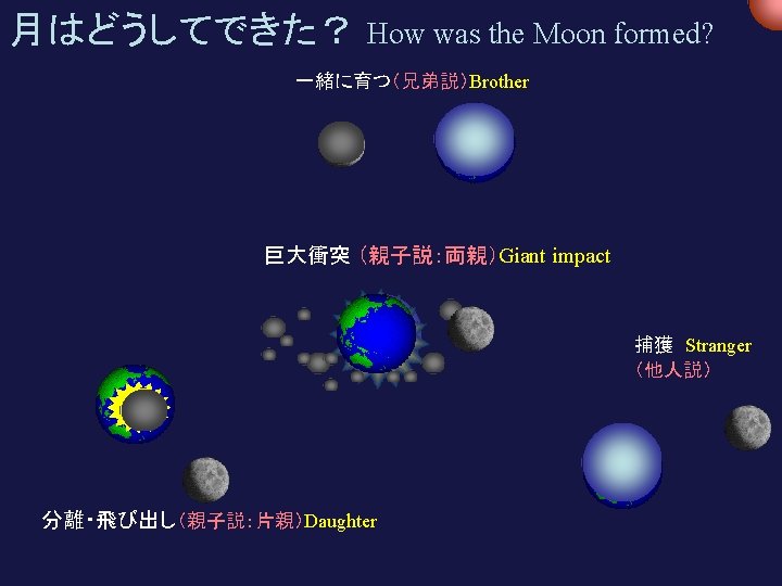45億年前の潮汐は今の 8000倍 4. 5 byr ago: Tide ~8000 times stronger (自転の遠心力は 25倍) Centrifugal force ~25 times stronger 過去(~ 45 億年前) 現在 Now Past (4. 5 byr ago) 1 day = 24 hours 1 day = 5 hours 20, 000 km 380, 000 km 月ー地球の距離は 1/20 Earth-moon distance was 1/20