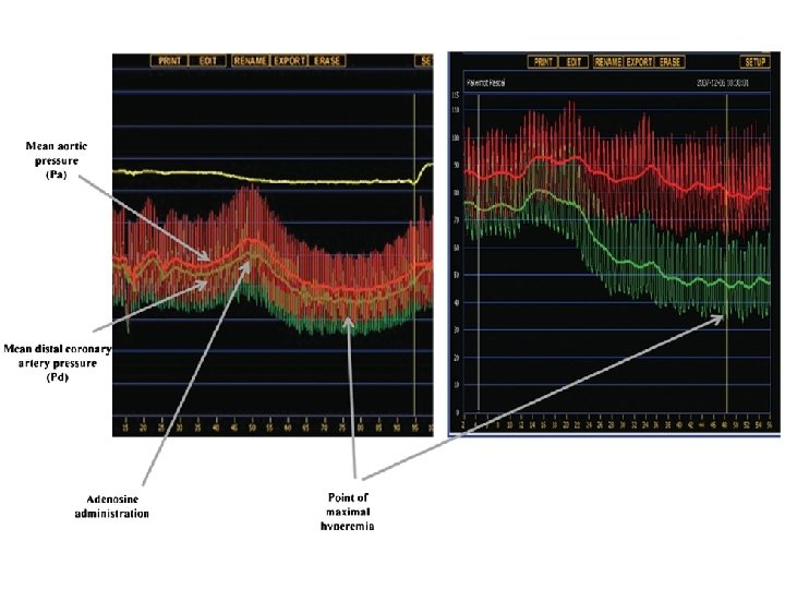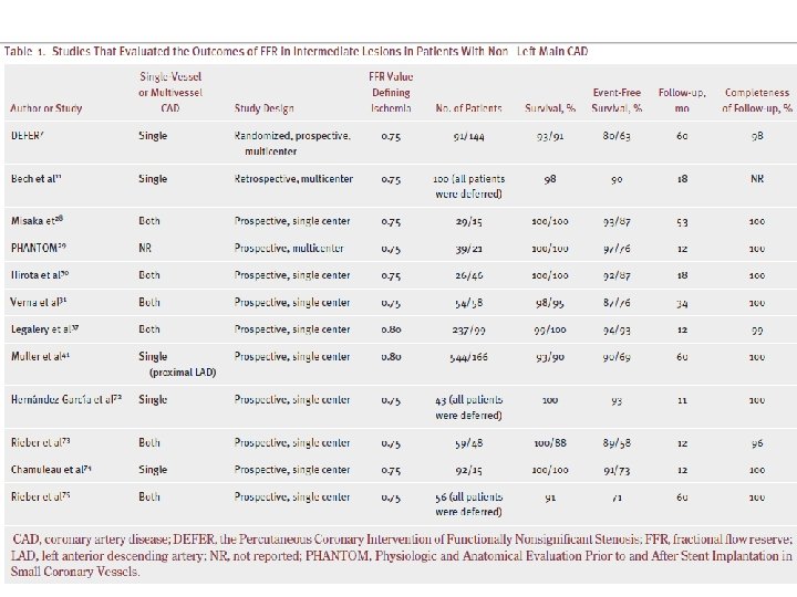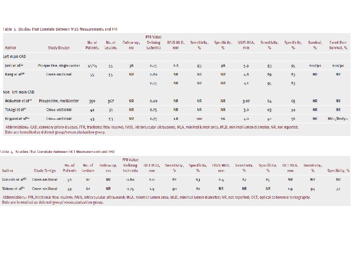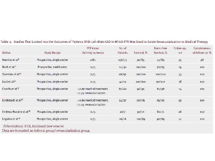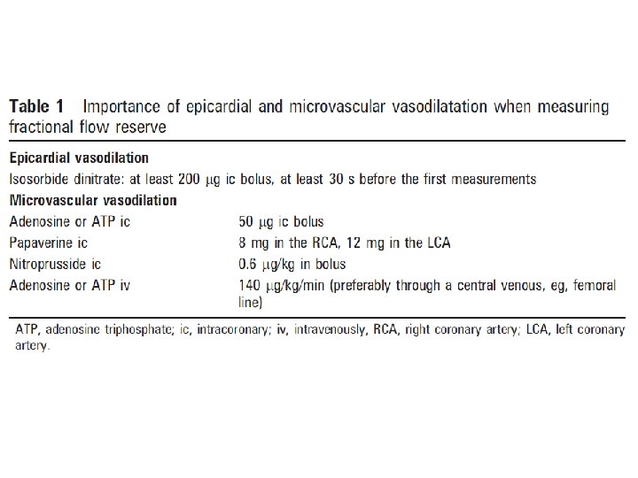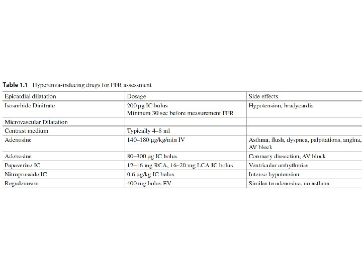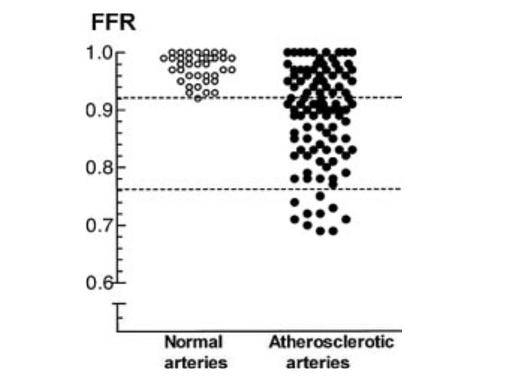 FFR • Normal value 1 • An FFR value of 0. 6 means the maximum myocardial flow across the stenosis is only 60% of what it should be without the stenosis • An FFR <0. 75 is associated with inducible ischemia (specificity, 100%), • An FFR a value >0. 80 indicates absence of inducible ischemia in the majority of patients (sensitivity, 90%).