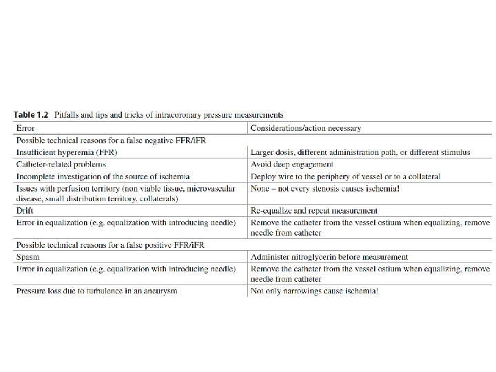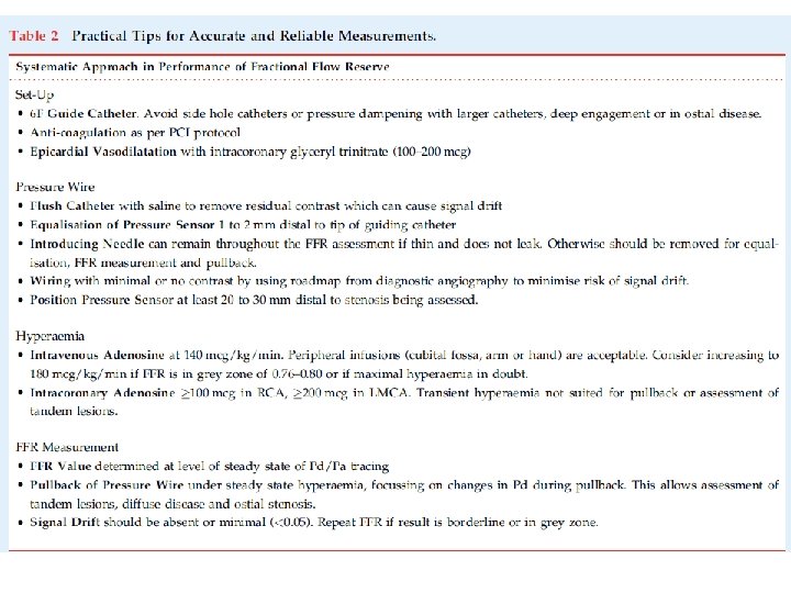 Positioning of the FFR wire or microcatheter • Pressure sensor should be positioned in the main vessel directly downstream the most distal leasion. • A second wire, in addition to the pressure sensor, could result in artefacts, and should therefore be avoided. • Be careful of artefacts: the sensor could interact with the vessel wall, especially in cases of a narrow vessel calibre or severe tortuosity. • Viscous contrast agent in the coronary artery can affect the gradient pd/pa. • In the case of a resting gradient <0. 80, measurement under hyperaemia is not necessarily required in order to make a clinical decision.