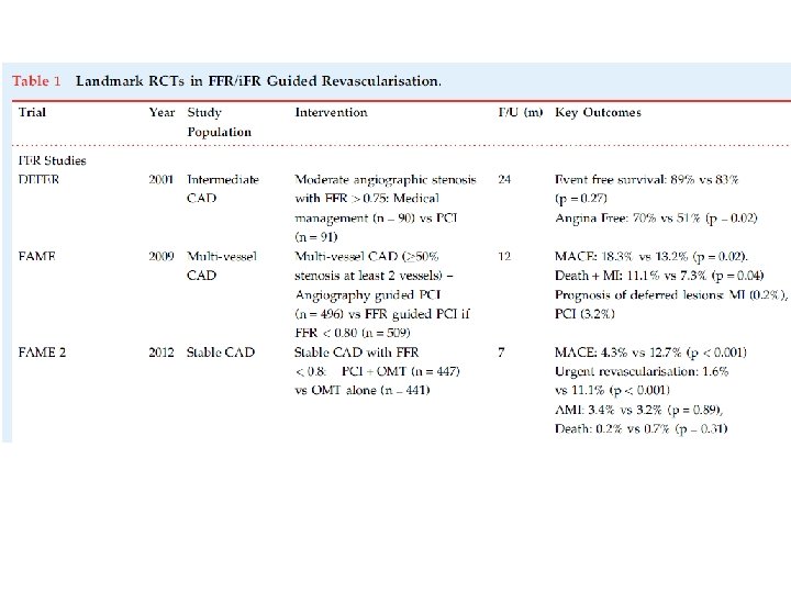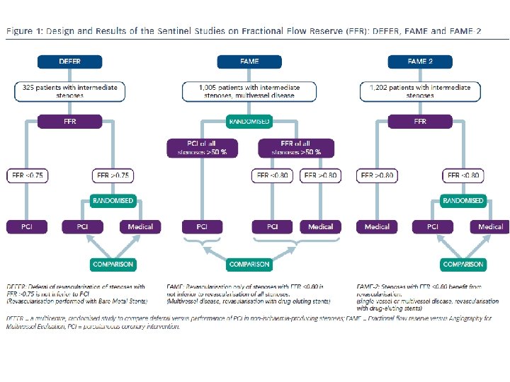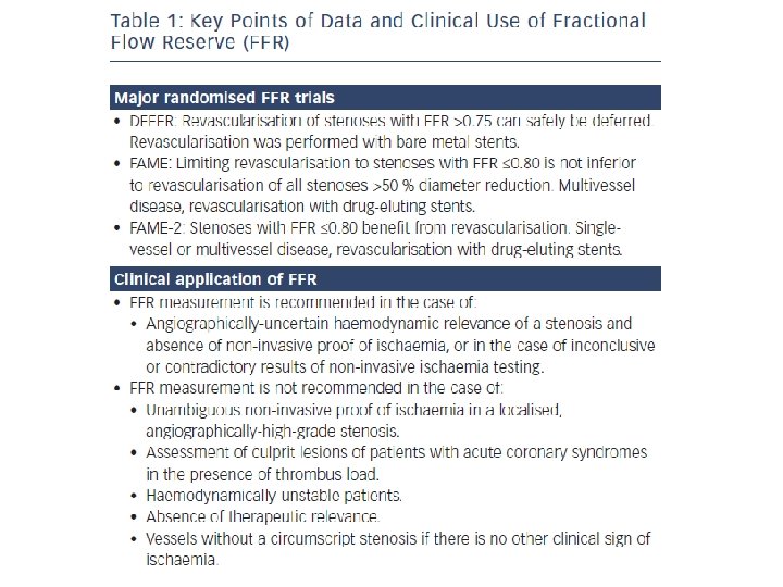 • certain patient groups were not included or tested in the randomised FFR studies. FAME studies, (excluded) • left main coronary artery stenosis, • recent history of STEMI • history of bypass surgery • impaired left ventricular (LV) systolic function (LV ejection fraction <30 %) • left ventricular hypertrophy (>13 mm) • there are currently no randomised, controlled outcome studies to validate FFR.