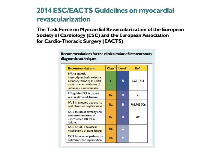 Acute coronary syndromes • In the case of STEMI, FFR measurement in the infarcted vessel is neither reasonable nor possible. In the case of NSTEMI, in the absence of a relevant thrombus load, lesions can be assessed using FFR during and after PCI • There is no established target value for FFR after PCI. • In the case of bifurcation lesion PCI, revascularisation of the side branch is not necessary if FFR is >0. 80 in the side branch