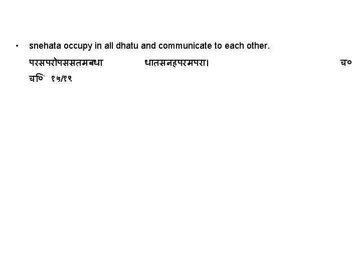 • Vitiation of kapha and meda are same as diet and external factors. • Dravya like ghee, oil and other substances similar to meda are dravya samanya and opposite to that is dravya vishesh such as yava and bajara. • The quality of both kapha and meda are nearly same as snigdh, sheet, guru, manda, shlakshna, sthir, Sandra, pichchhil and mridu. • medo vriddhi is homologous to shleshmavikar. • ������������� �������������� �� /�� • On the basis of karma, meda has sneh, bandh, dridhatwa and mriduta same as function of kapha is sneha, bandha, sthiratvam and heaviness. • weaning of kapha leads to shleshmashaya shunyata, rough, sandhisaithilya, bhrama (dizziness) and same as deficit of medadhatu creates the symptoms of swapanakati, plihavriddhi (spleenomegaly), weaning of organs and shosh (cachexia).