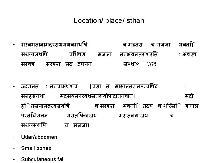 Medo dhatu kshaya lakshana • Joints of body become dry and painful • Unctuousness of eyes and fecal matter is due to mala of majja dhatu. • Sensation loss at pelvic region, • Plihavriddhi (splenomegaly) and reduction of body mass. • Demanding more unctuous & heavy diet. • sandhisunyata • Body becomes lean and thin specially abdominal region. • मद कषय मदरम स • सध न मदस पल ह भ वदध पर रथन सफटन कष ण सनध शनयत र कषय च । (स. स. १५/१३) गल न रकषण र य स तनतव च दरसय च। एव च। लकषण