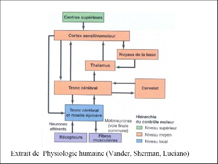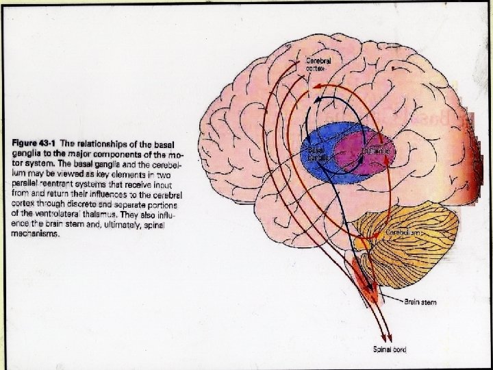 IV/Relation des NGC avec les composants majeurs du système moteur Les ganglions de la base et le cervelet apparaissent comme les éléments clé de deux systèmes réentrants parallèles, recevant et projetant leurs influences au cortex cérébral à travers de discrètes portions séparées du thalamus ventrolatéral. Ils influencent également le TC et finalement des mécanismes spinaux sans avoir de projections directes sur les motoneurones. Ils ont un rôle essentiel dans l’initiation, la planification et le contrôle du déroulement du mouvement.