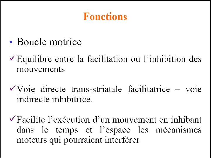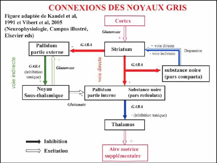2/ Le circuit squeletto-moteur Le circuit moteur squelettique implique le cortex moteur précentral (les aires 4 et 6 de Brodmann) et le cortex somatosensoriel post central qui projettent sur le putamen. Le putamen projette à son tour sur les structures efférentes du GPi ventral et la SNr. Ces noyaux projettent respectivement sur les noyaux Vop (VLa) et Voa (VA) du thalamus. A l’intérieur de cette boucle motrice les auteurs distinguent deux voies sur la base de l’existence de deux sous populations de neurones striataux selon leurs cibles et leur sensibilité à la dopamine. Les neurones synthétisant le neuropeptide substance P projettent monosynaptique ment sur les deux noyaux de sortie des NGC (GPi et SNr), constituant ce que l’on appelle la voie directe. Ceux contenant la Dynorphine et l’Enképhaline projettent sur le GPe dont les efférences ciblent le NST puis de ce noyau projettent sur GPi / SNr. Cette projection polysynaptique vers les noyaux de sortie est appelée voie indirecte. Les deux voies ont des rôles fonctionnels opposés puisque l’activation de la voie directe induit une réduction de l’activité des noyaux de sortie conduisant à une désinhibition de l’activité thalamocorticale. Les conséquences en sont une facilitation des mouvements. A l’inverse, l’activation de la voie indirecte aboutit à une inhibition de l’activité thalamocorticale ce qui tend à réduire les mouvements. En effet, l’interposition du NST entre le GPe et les noyaux de sortie entraîne une hyperactivité des GPi / SNr car le NST est excitateur et voit son activité augmenter lorsqu’il n’est plus inhibé par les afférences du GPe. On parle ici aussi de dés inhibition. Les projections du cortex sur les NGC et les projections réciproques thalamocorticale sont glutaminergiques excitatrices.