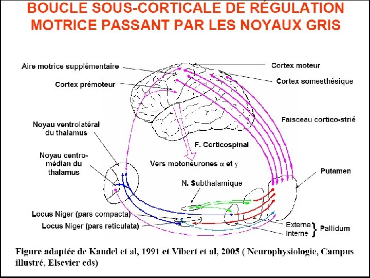 VI/Réseau de circuits en boucles parallèles cortico-striato-pallido-thalamo-corticales En 1980 un modèle de fonctionnement des NGC a été proposé, Ce modèle rend compte du fonctionnement normal du système dans la régulation des mouvements, mais aussi du fonctionnement pathologique dans les syndromes hyper et hypokinétiques. Il s’agit d’un réseau comportant plusieurs circuits en parallèles qui impliquent les NGC et les voies thalamo corticales. Chaque circuit est indépendant et assure un rôle particulier, moteur, associatif ou limbique. Ils sont constitués de boucles cortico-striato-pallido-thalamo-corticales reliant des aires corticales spécifiques à des territoires indépendants des NGC qui projettent en retour sur les mêmes aires corticales via des noyaux de relais spécifiques du thalamus.