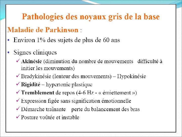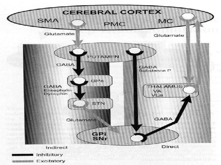 Physiopathologie de la maladie de Parkinson L’activité excessive de la voie indirecte au niveau du STN apparait comme un facteur important dans la production des signes parkinsoniens ; exp singes traités par MPTP(dérivé de la méperidine: 1 methyl; 4 phényl; 1, 2, 3, 6, tetra hydro-pyridine). La perte des afférences dopaminergiques à partir de la substance noire pars compacta_au striatum entraine une augmentation de l’activité dans la voie indirecte et une diminution de l’activité dans la voie directe (en raison de l’action différente de la dopamine sur les deux voies via les récepteurs D 1 et D 2) Ces deux actions entrainent une augmentation de l’activité dans le Gpi : ce qui entraine une augmentation de l ’inhibition thalamo-corticale et des neurones tegmentales du diencéphale et d’où les caractères hypokinétiques de la maladie Les signes moteurs anormaux sont réversibles par l’administration systémique d’agonistes des récepteurs de la dopamine: exp Apomorphine.
