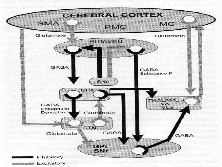 3/Autres connexions Plus récemment, d’autres connexions ont été décrites. Il existe notamment des projections directes excitatrices des aires motrice supplémentaire AMS (SMA) et prémotrice (PMA) corticales sur le NST. Ce noyau envoie des projections en retour vers le GPe. On a aussi identifié des projections du GPe vers les noyaux GPi / SNr.