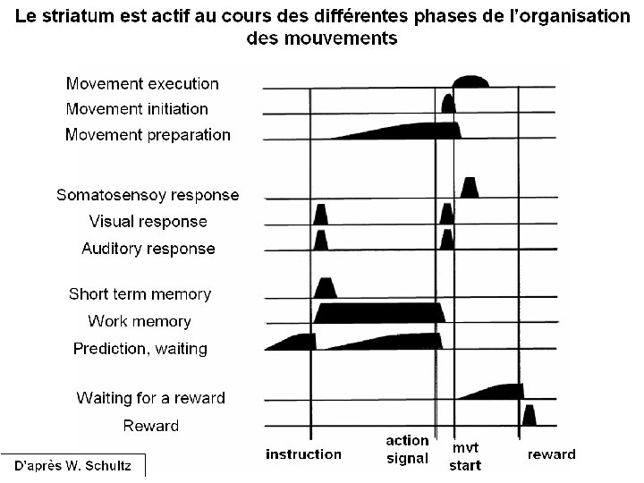 Données électrophysiologiques Le réseau des NGC aurait ainsi un rôle dans la sélection et le calibrage spatial (focalisation) et temporel des mouvements (amplitude). Des études avec enregistrement unitaire de neurones chez le singe entraîné à exécuter des mouvements appris montrent en effet que le circuit moteur des NGC est impliqué aussi bien dans l’exécution que dans la préparation des mouvements volontaires.