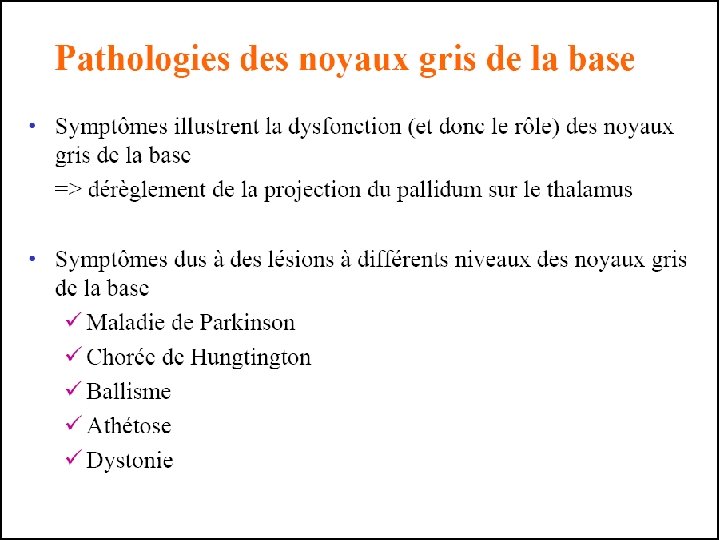 X/ Conclusion Les études expérimentales récentes ont données de nouvelles approches pharmacologiques et neurochirurgicales pour le traitement des malades et ceux grâce à une bonne connaissance du fonctionnement normal et pathologique des circuits parallèles impliquant les NGC.