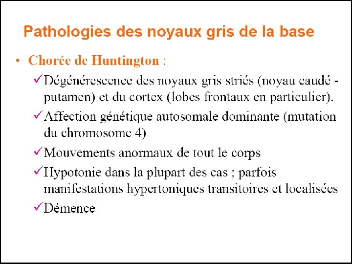 IX/ Pathologie des NGB L’altération du fonctionnement du circuit moteur squelettique impliquant les NGC donne naissance à des pathologies du mouvement dans le sens d’un ralentissement(akinésie de la maladie de parkinson par exemple)ou des mouvements involontaires (syndromes hyperkinétiques, dyskinésies). Si les désordres fonctionnels touchent les autres circuits, ils peuvent donner lieu à des troubles de l’action(impulsivité, apathie) pour le circuit associatif, de l’humeur(manie, dépression) ou des troubles obsessionnels compulsifs (TOC) pour le circuit limbique orbito frontal latéral
