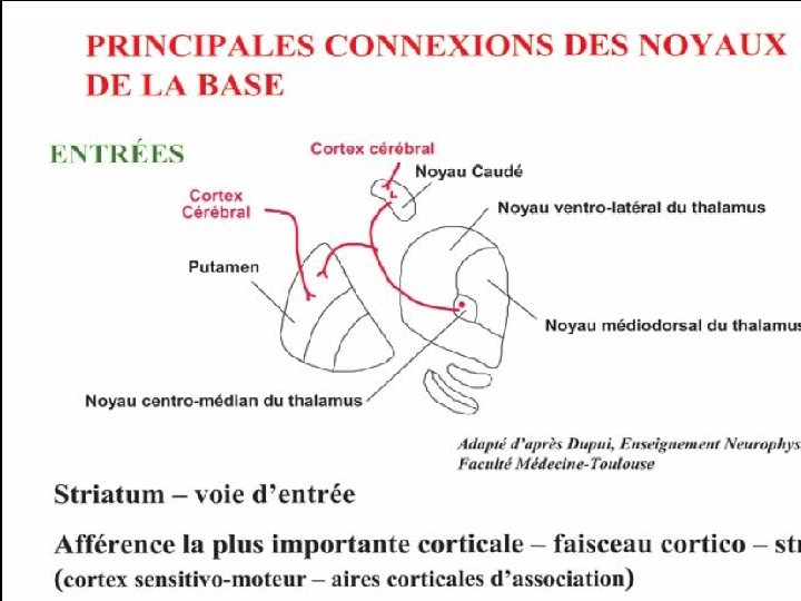 2/ Le circuit squeletto-moteur Le circuit moteur squelettique implique le cortex moteur précentral (les aires 4 et 6 de Brodmann) et le cortex somatosensoriel post central qui projettent sur le putamen. Le putamen projette à son tour sur les structures efférentes du GPi ventral et la SNr. Ces noyaux projettent respectivement sur les noyaux Vop (VLa) et Voa (VA) du thalamus. A l’intérieur de cette boucle motrice les auteurs distinguent deux voies sur la base de l’existence de deux sous populations de neurones striataux selon leurs cibles et leur sensibilité à la dopamine. Les neurones synthétisant le neuropeptide substance P projettent monosynaptique ment sur les deux noyaux de sortie des NGC (GPi et SNr), constituant ce que l’on appelle la voie directe. Ceux contenant la Dynorphine et l’Enképhaline projettent sur le GPe dont les efférences ciblent le NST puis de ce noyau projettent sur GPi / SNr. Cette projection polysynaptique vers les noyaux de sortie est appelée voie indirecte. Les deux voies ont des rôles fonctionnels opposés puisque l’activation de la voie directe induit une réduction de l’activité des noyaux de sortie conduisant à une désinhibition de l’activité thalamocorticale. Les conséquences en sont une facilitation des mouvements. A l’inverse, l’activation de la voie indirecte aboutit à une inhibition de l’activité thalamocorticale ce qui tend à réduire les mouvements. En effet, l’interposition du NST entre le GPe et les noyaux de sortie entraîne une hyperactivité des GPi / SNr car le NST est excitateur et voit son activité augmenter lorsqu’il n’est plus inhibé par les afférences du GPe. On parle ici aussi de dés inhibition. Les projections du cortex sur les NGC et les projections réciproques thalamocorticale sont glutaminergiques excitatrices.