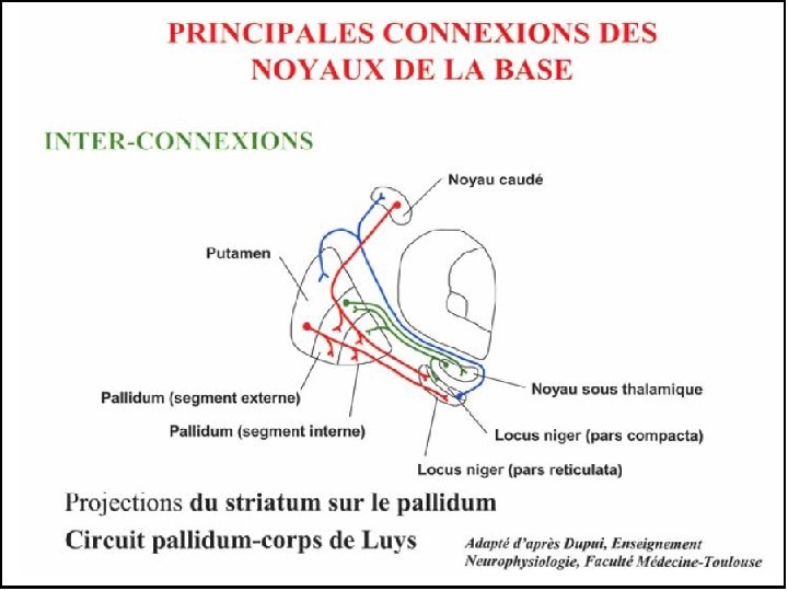 II/ Données anatomiques NOYAUX OU GANGLIONS DE LA BASE: Quatre Noyaux bilatéraux et symétriques: Noyau caudé Ø Le Striatum: (même cyto-architecture-beaucoup de connexions identiques) Putamen Ø Pallidum ou globus pallidus Ø Noyau sous thalamique ou corps de luys Ø Substance noire ou substancia nigra ou locus niger (pars réticulata-pars compacta (dopamine))