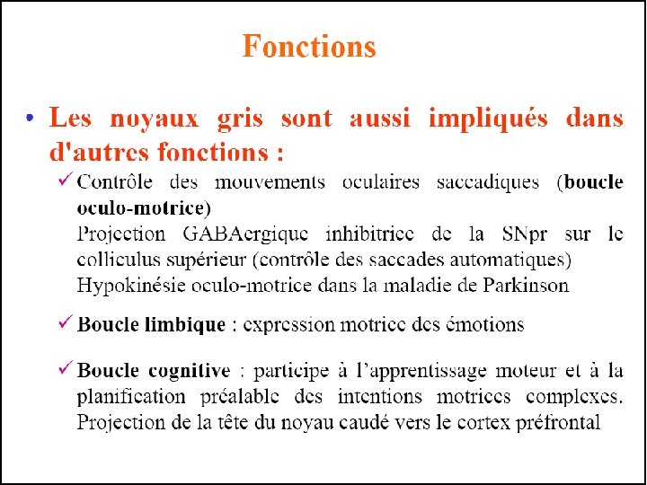 4/Circuits cognitifs Les NGC ont également un rôle dans les activités cognitives, l’humeur et les comportements non moteurs. On décrit ainsi trois autres circuits cortico-striato-pallido -thalamo-corticaux : Le circuit préfrontal dorsolatéral est impliqué dans les fonctions exécutives (préparation et programmation des actions) qui mettent en jeu les aires associatives du cerveau. Il prend son origine dans les aires 9 et 10 de Brodmann et projette sur la tête du noyau caudé qui projette sur le GPi/SNr. De ces noyaux les projections gagnent les noyaux Ventral Antérieur et Medio Dorsal du thalamus qui projettent en retour sur le cortex préfrontal dorsal. Le circuit orbitofrontal latéral implique la partie ventro médiane du noyau caudé, le pallidum interne et la SNr et le thalamus qui projette en retour sur le cortex orbito frontal. Ce circuit joue un rôle dans l’empathie et les réponses appropriées aux stimuli sociaux. Le circuit cingulaire antérieur projette sur le striatum ventral. Celui-ci reçoit également des afférence limbiques de l’amygdale, l’hippocampe et le cortex entorhinal. Le striatum ventral projette sur le pallidum ventral qui relaie vers les noyaux Centre Médian et Para fasciculaire du thalamus. Ce circuit joue un rôle important dans la motivation des comportements.
