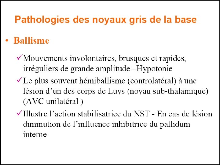 X/ Conclusion Les études expérimentales récentes ont données de nouvelles approches pharmacologiques et neurochirurgicales pour le traitement des malades et ceux grâce à une bonne connaissance du fonctionnement normal et pathologique des circuits parallèles impliquant les NGC.