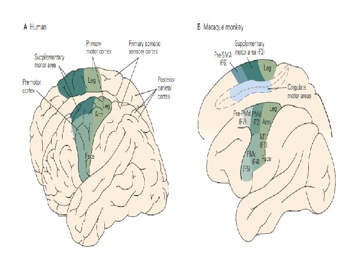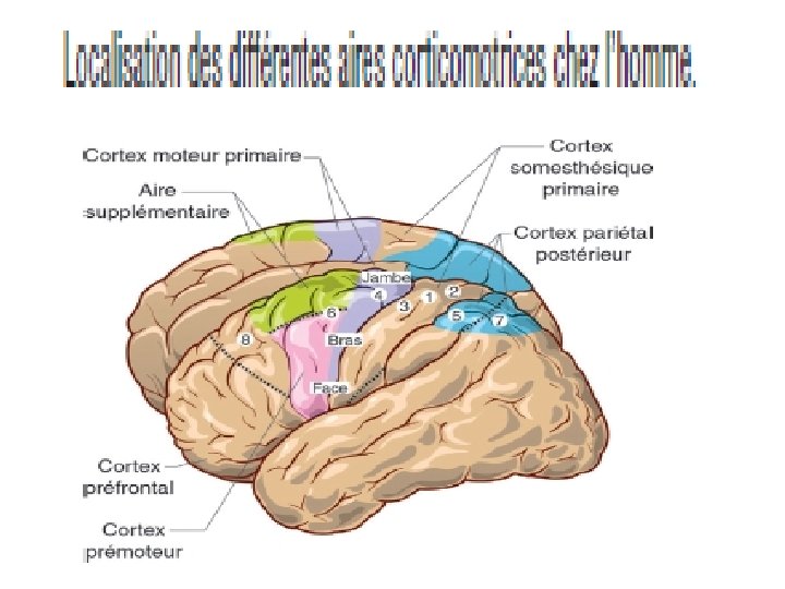 2/CORTEX PREMOTEUR • Occupe une partie de l’aire 6 de BRODMANN • Agranulaire sans cellules de BETZ • Expérience de stimulation : • Réponses plus tardives et plus durables et plus complexes • Somatotopie: dans le sens antéro-post