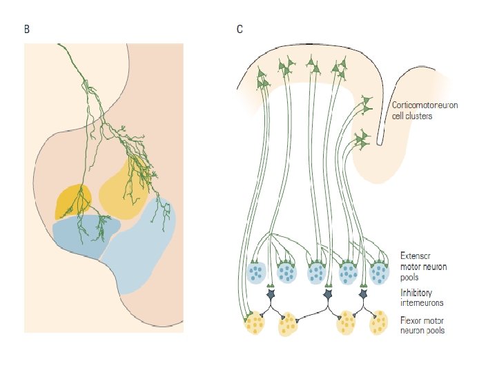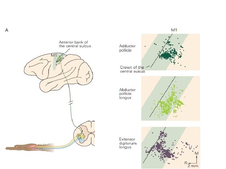 • Representation en mouvements organisés et non des muscles un muscle est représenté plusieurs fois : mosaïque complexe(2 à 3 mm chez le primate) les connexions horizontales créent un ensemble de neurone coordonnant un pattern de décharge de population de Cellules de la corne ventrale