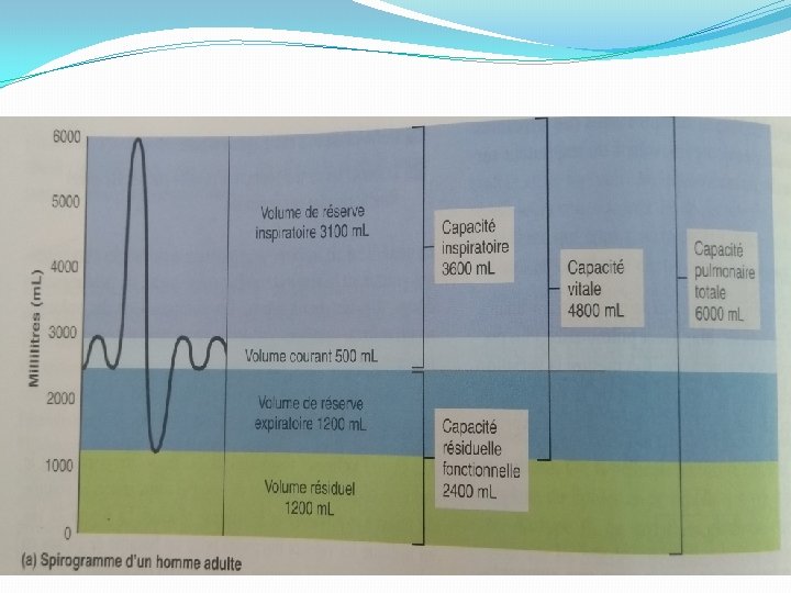4° Volumes respiratoires et épreuves fonctionnelles respiratoires Ø La quantité d’air inspirée et expirée varie suivant les conditions qui entourent la respiration. Par conséquent, on peut mesurer divers volumes respiratoires. Les combinaisons des volumes respiratoires appelées capacités respiratoires, révèlent l’état respiratoire. a) Volumes respiratoires Ø Les volumes que nous utilisons ce sont les valeurs d’un homme de 20 ans en bonne santé pesant environ 70 kg Ø Le volume résiduel contribue au maintien des alvéoles libres (ouvertes) et à la prévention de l’affaissement des poumons