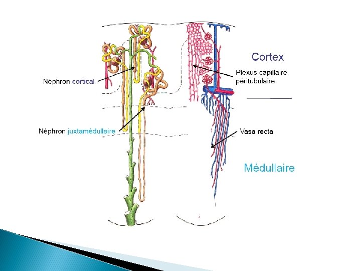 Organisation de la vascularisation - AE corticales → plexus capillaire cortical péritubulaire. - AE juxta-médullaires : → artérioles droites = vasa recta Vasa recta ≈ Vx descendants et ascendants parallèles et accolés aux Br descendantes et ascendantes AH et qui forment un plexus capillaire médullaire parcourant la médullaire externe et interne.