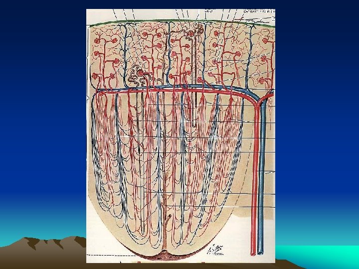 Vascularisation du rein • les artères intra-rénales – les branches de division de l'artère rénale – donnent naissance aux artères interlobaires – d'où partent les artères arquées – puis, les artères interlobulaires – desquelles partent les artérioles afférentes – puis les artérioles efférentes – qui donnent naissance aux capillaires péri tubulaires • les veines suivent sensiblement la même disposition que les artères