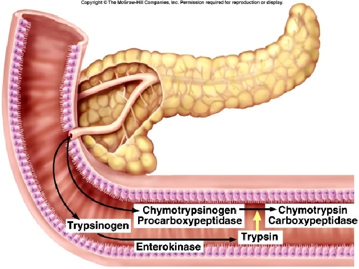 Pancreas • Exocrine - Acini part of pancreas - secretes zymogens: – Trypsionogen: Activated by enterokinase trypsin (digests proteins) by activating other enzymes: • • – – Chymotrypsinogen chemotrypsin (digest proteins) Procarboxypeptidase (digest proteins) Pancreatic Amylase: Digests starch. Pacreatic Lipase: Digests lipids • Exocrine - Pancreatic ducts: secrete sodium bicarbonate, alkaline fluid that neutralizes acid in chyme. • Endocrine - Islets of Langerhan’s cells secrete insulin and glucagon (discussed with endocrines)