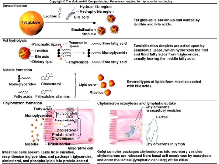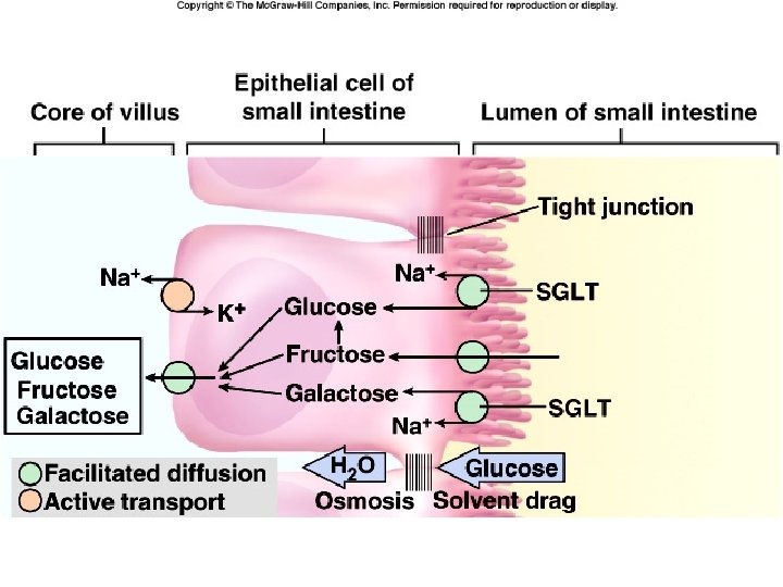 Nutrient Absorption in Small Intestine • Nutrients are absorbed as monomers of each macromolecule, – Carbohydrates as monosaccharides, – Proteins as amino acids, – Fats as fatty acids and monoglycerides – Nucleic acids as nucleotides • Hydrophilic nutrients are absorbed into small intestine and into the blood stream, • Lipids are absorbed into the lymphatic system and routed to the liver,