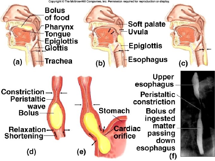 Swallowing (Deglutition) • Swallowing center (in medulla oblongata) coordinates muscle movements to push food bolus into esophagus (voluntary), • Once bolus passes to oropharynx parasympathetic system ‘takes over’ • Bolus moves through peristalsis; a wave of longitudinal muscular contractions than continue until materials reach colon, • In esophagus - gravity moves food into stomach faster than peristalsis.