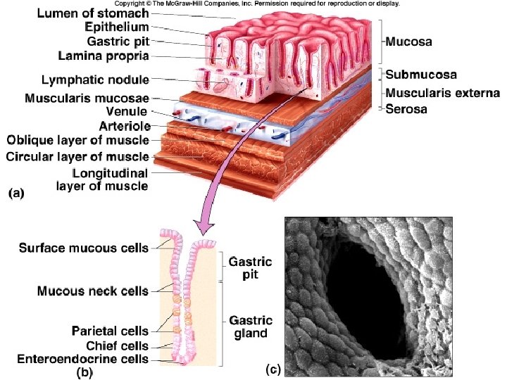 Food is mixed with Stomach secretions • Protein and fat digestion begins in stomach, bolus is now called chyme (white fluid substance), • Innervation and Circulation of Stomach – Receives parasympathetic and sympathetic innervation, – All blood draining from stomach and intestines passes through the liver before the heart, • Stomach Wall: – Composed of same 4 layers of tissue as rest of GI tract, – Gastric mucosa has depressions called gastric pits into which gastric tubular glands empty, – Smooth muscle of muscularis externa layer contracts to mix and churn chyme.