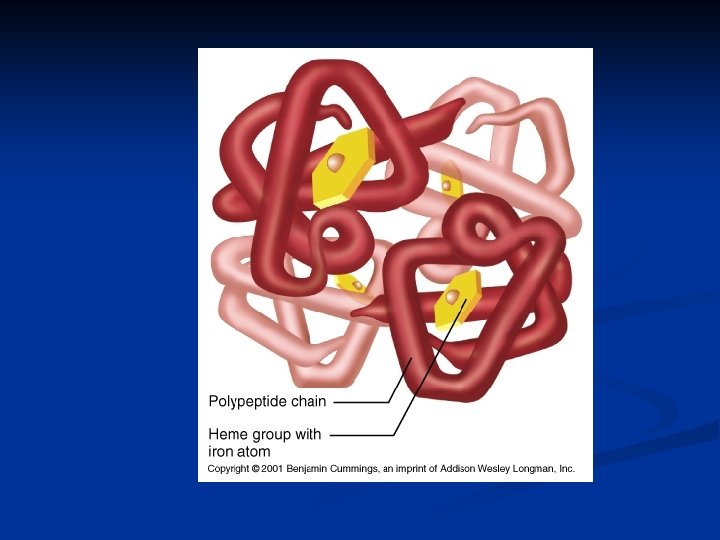 Hemoglobin n Quaternary Structure n Four Globin proteins n n Four Heme attach to each Globin n n Globin carries CO 2, H+, PO 4 Heme binds O 2 and CO Heme contains an Iron ion About 1 million hemoglobin molecules per red blood cell Oxygen carrying capacity of approximately 5 minutes