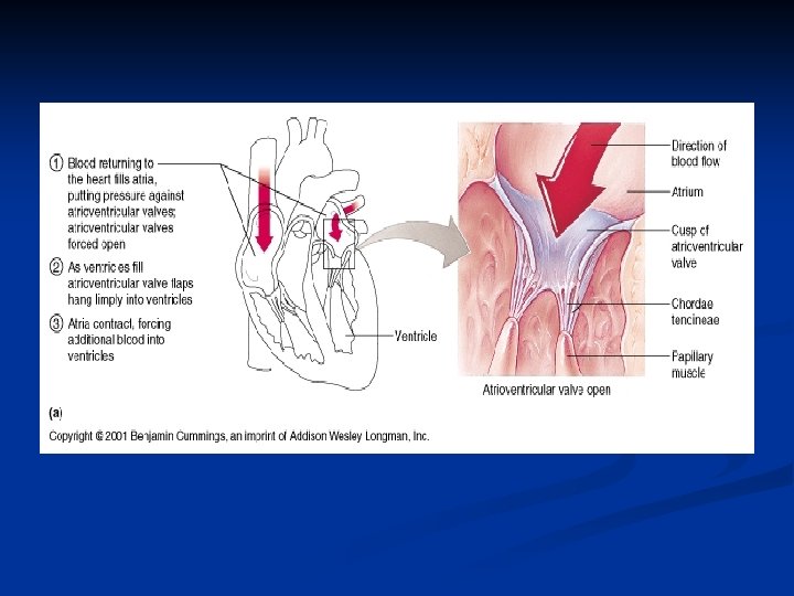Atrial and Ventricular Diastole The heart at rest n The atria are filling with blood from the veins n The ventricles have just completed contraction n AV valves are open n Blood flow due to gravity n
