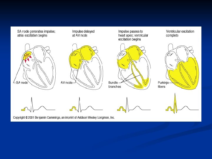Electrical Conduction in the Heart Coordinates Contraction n n n Action potential in an autorhythmic cell Depolarization spread rapidly to adjacent cells through gap junctions Depolarization wave is followed by a wave of contraction across the atria from the sinoatrial node on the right side of the heart across to the left side of the heart and then from the base to the apex From AV nodes to the atrioventricular bundle in the septum (Bundle of His) Left and right bundle branches to the apex Purkinje Fibers through the ventricles branches from apex to base and stopping at the atrioventricular septum