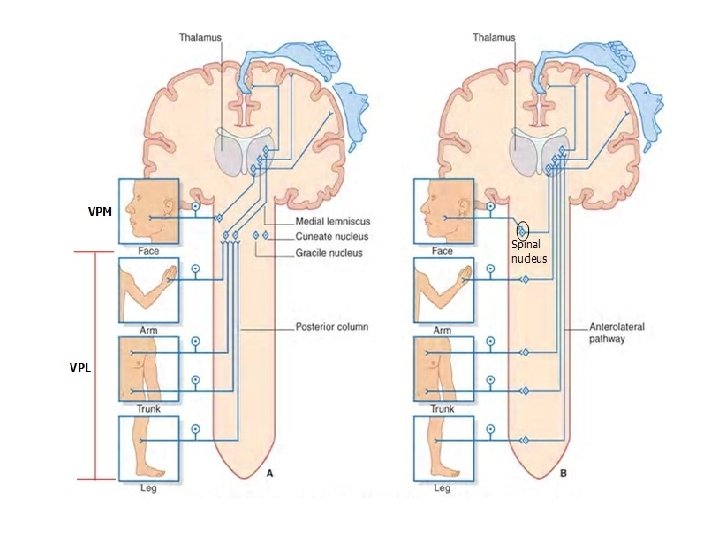 Thermal Sensations Pathway: anterolateral system (lateral spinothalamic tract) A) 1 st order neuron : • A delta and C afferent fibers • Cold receptors connected with A delta and warm receptors are connected with C fibers B) 2 nd order neuron : • Lateral spinothalamic tract and in brain stem as spinal leminiscus • End in posteroventral nucleus of thalamus (PVNT)